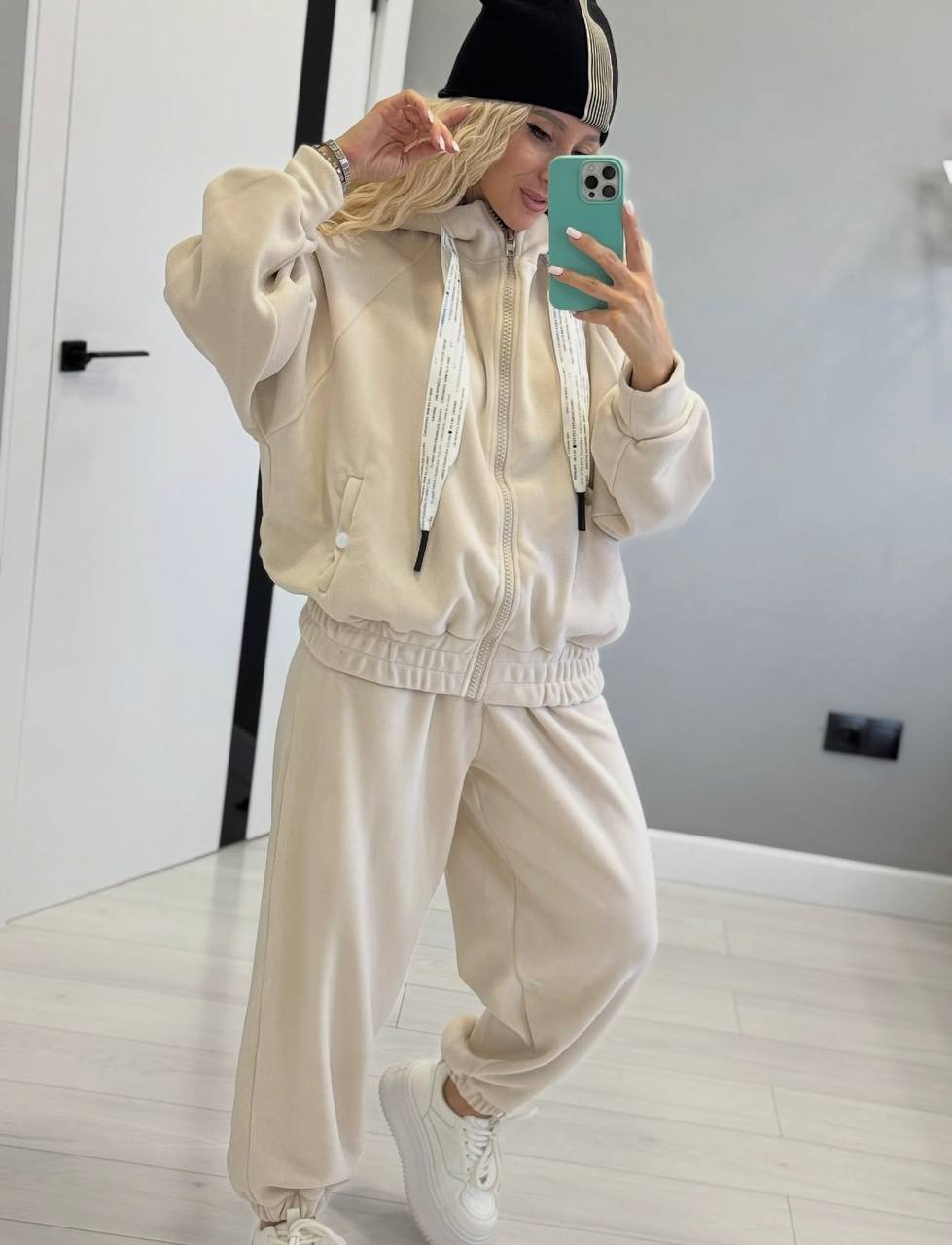 Головна » Магазин » ОДЕЖДА » ЖЕНСКИЕ СПОРТИВНЫЕ КОСТЮМЫ » Флисовый костюм: кофта с капюшоном+широкие штаны беж