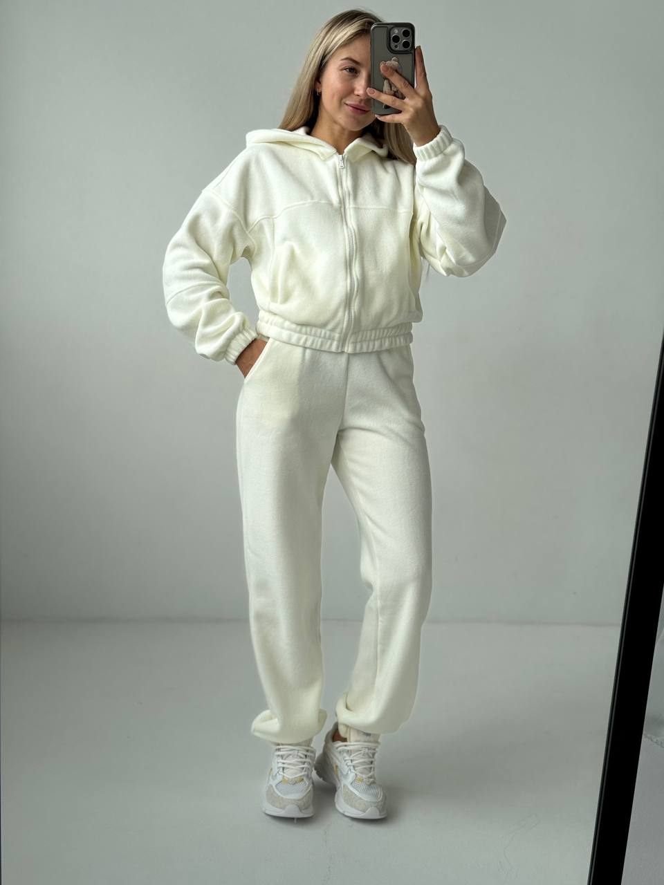 Флисовый костюм (худи на молнии+брюки высокая посадка) молочный