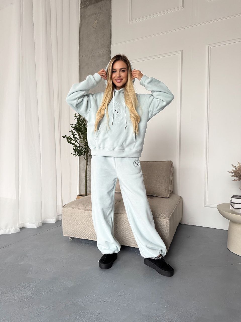Головна » Магазин » ОДЕЖДА » ЖЕНСКИЕ СПОРТИВНЫЕ КОСТЮМЫ » Флисовый спортивный костюм (кофта с капюшоном+накатом+свободные брюки) голубой