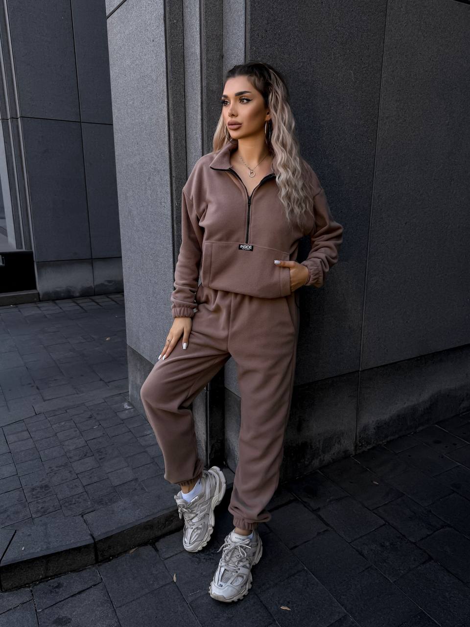 Флисовый теплый костюм: кофта со стойкой на змейке+штаны с карманами мокко