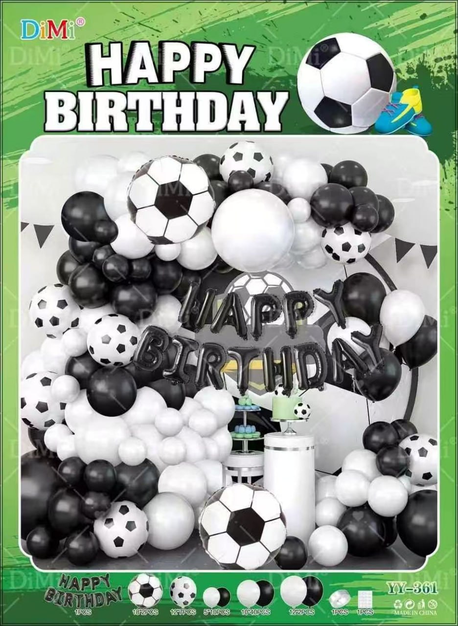 Дизайн: арка из шаров в черно-белой гамме с футбольными принтами + надпись «HAPPY BIRTHDAY» + декоративные элементы с мячами и праздничными аксессуарами — спортивно, динамично, празднично
