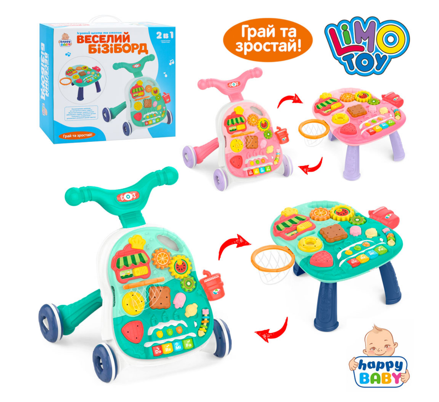 Ходунки – каталка оснащены яркими игрушками, которые не только привлекают внимание малышей, но и способствуют раннему развитию. С такой каталкой ребенок сможет делать первые шаги, держась за ручку или играть с интерактивной панелью столика.