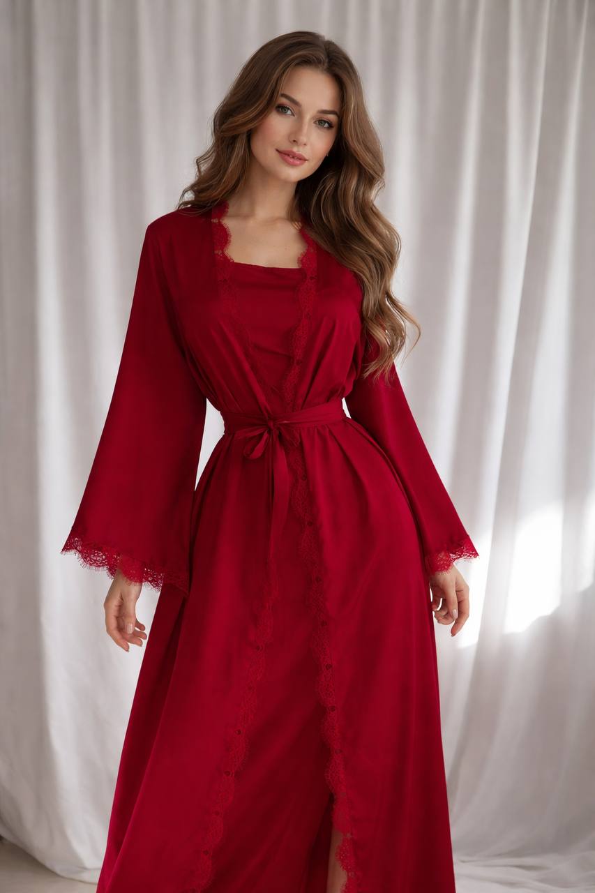 Шелковый комплект с кружевом: халат + платье красный
