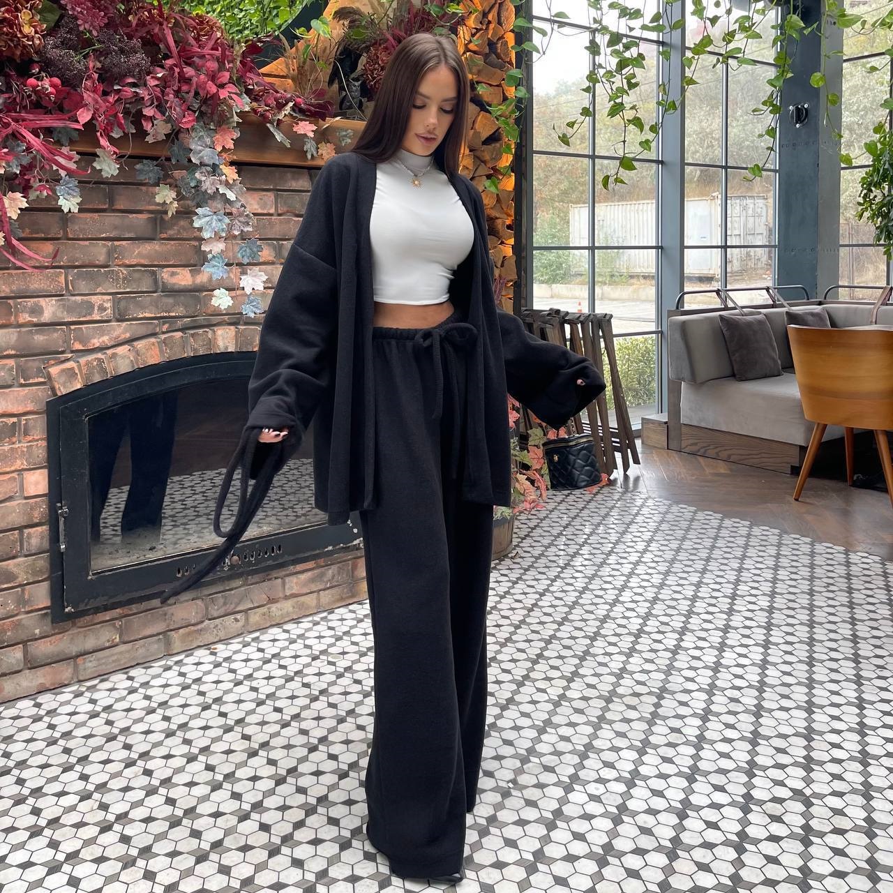 Будьте первым, кто оставил отзыв на “Шерстяной комплект (удлиненный кардиган на запах под пояс+палаццо высокой посадки) ангора черный”
