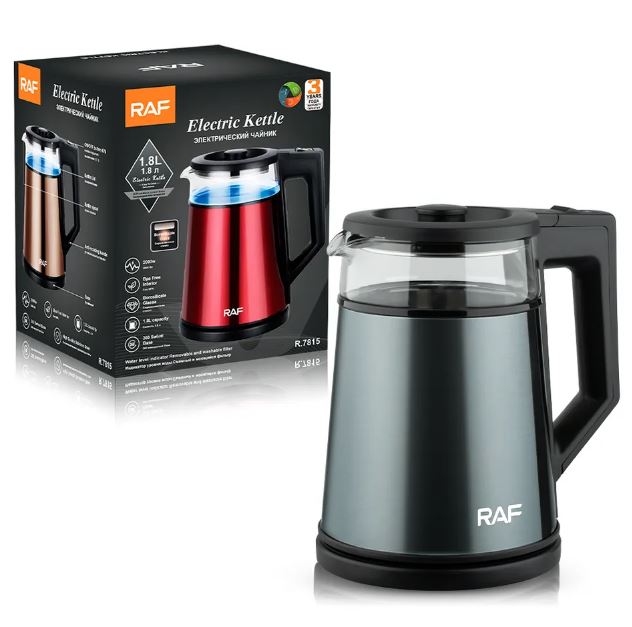 Чайник RAF R.R.7815 объёмом 1,8 л. Корпус сделан из прозрачного термостойкого стекла, благодаря чему в воде просто неоткуда появиться неприятным привкусам или даже опасным для здоровья веществам. Внутренний световой индикатор работы эффектно озаряет кипящую воду голубым светом. При нажатии кнопки механизм открывания крышки срабатывает мягко и плавно, исключая разбрызгивание конденсата с крышки. Скрытый нагревательный элемент обеспечивает быстрое кипячение, надежность и простоту очистки чайника, а встроенный контроллер защищает от перегрева. Комплексная система безопасности для предотвращения короткого замыкания и выкипания воды. Защита от перегрева обеспечит автоматическое выключение при недостаточном уровне воды.