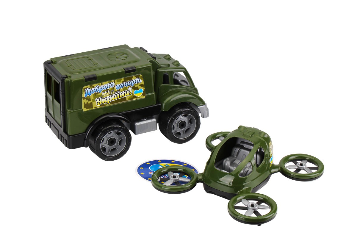 Презентуємо іграшковий набір, що складається з військового автомобіля та квадрокоптера. Для руху по дорогах та по бездоріжжю в автомобіля міцна рама та великі колеса. Задні двері автомобіля відкриваються, в кузові можна перевозити не тільки відважних захисників, а й різні вантажі — зброю, боєприпаси та інше.