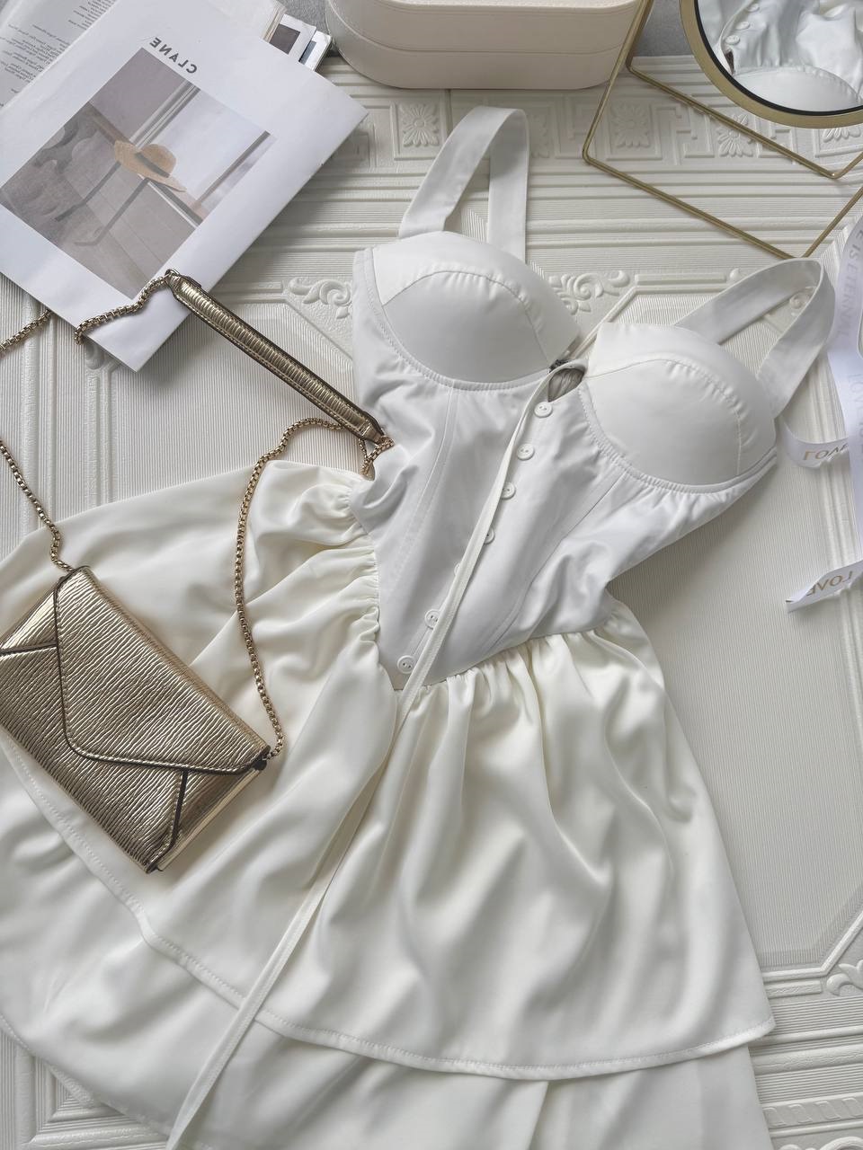 Атласный комбинезон с двойной юбкой+акцентной зоной декольте на широких бретелях молочный