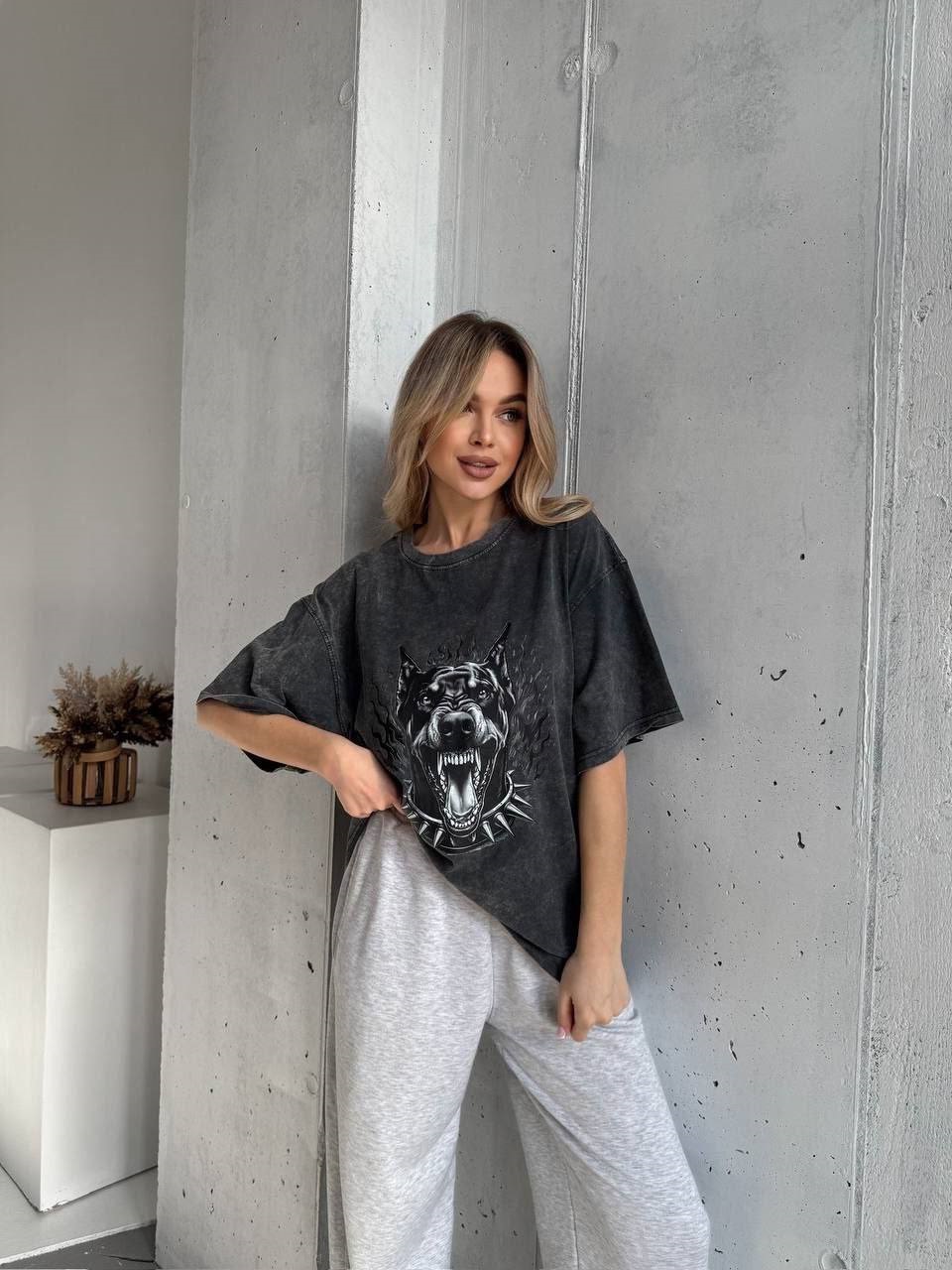 Базовая футболка свободного кроя принт СОБАКА хлопок графит