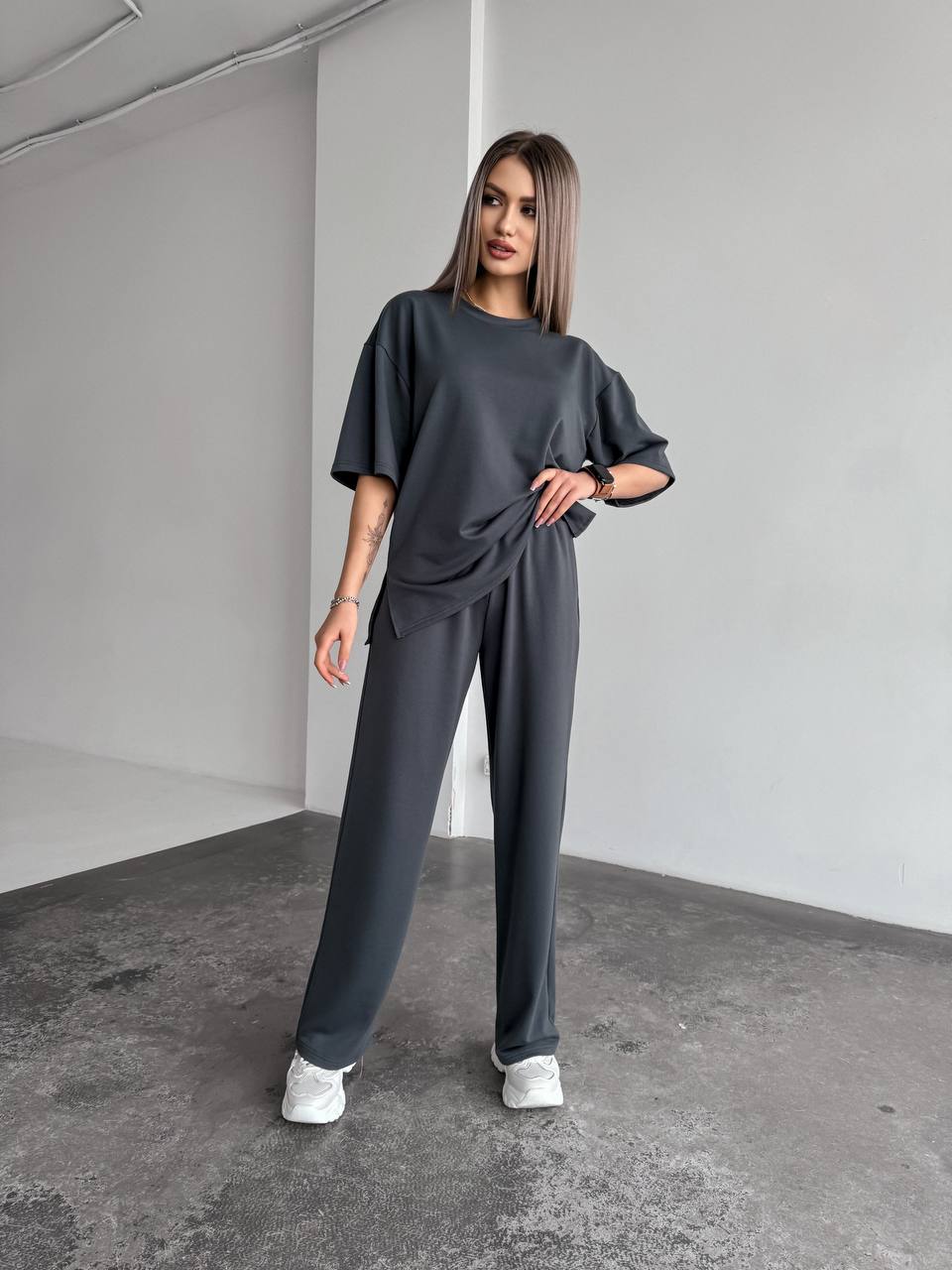 футболка со спущенным рукавом, с разрезами по низу;