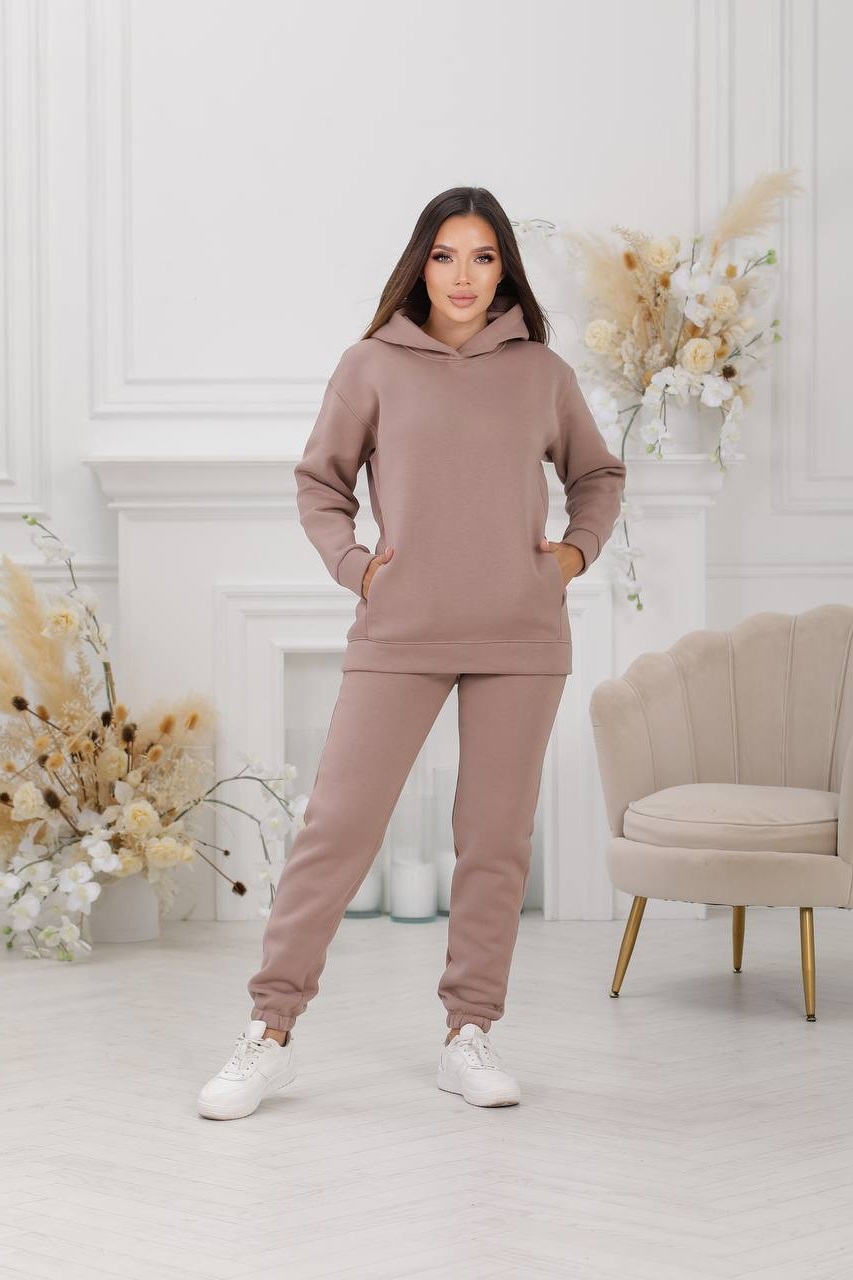 Базовый теплый костюм брюки с высокой посадкой+свободная удлиненная кофточка с карманами беж