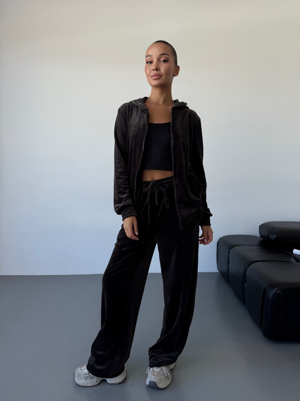 Базовый вилюровый костюм: кофта с капюшоном+брюки прямого кроя шоколад