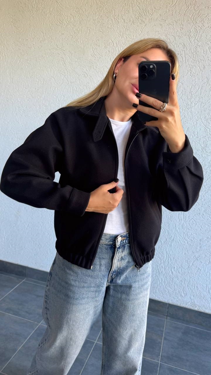 Бомбер застегивается на молнию, с двумя карманами, внизу манжета на резинке.