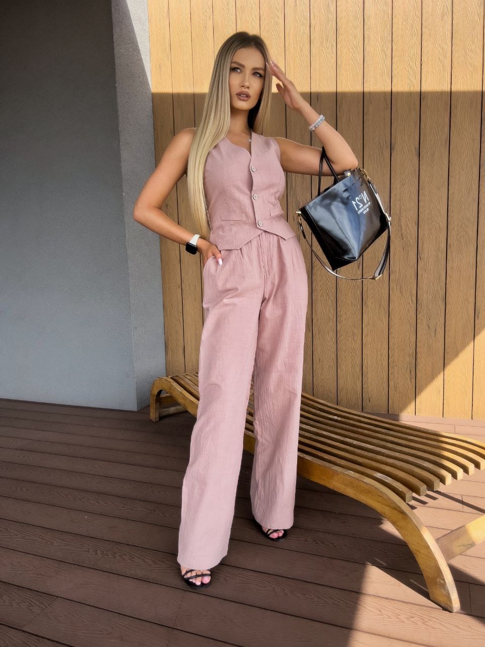 Базовый костюм-двойка (жилетка + штаны палаццо), жилет регулируется в объеме в области спинки, застежка на пуговицы.