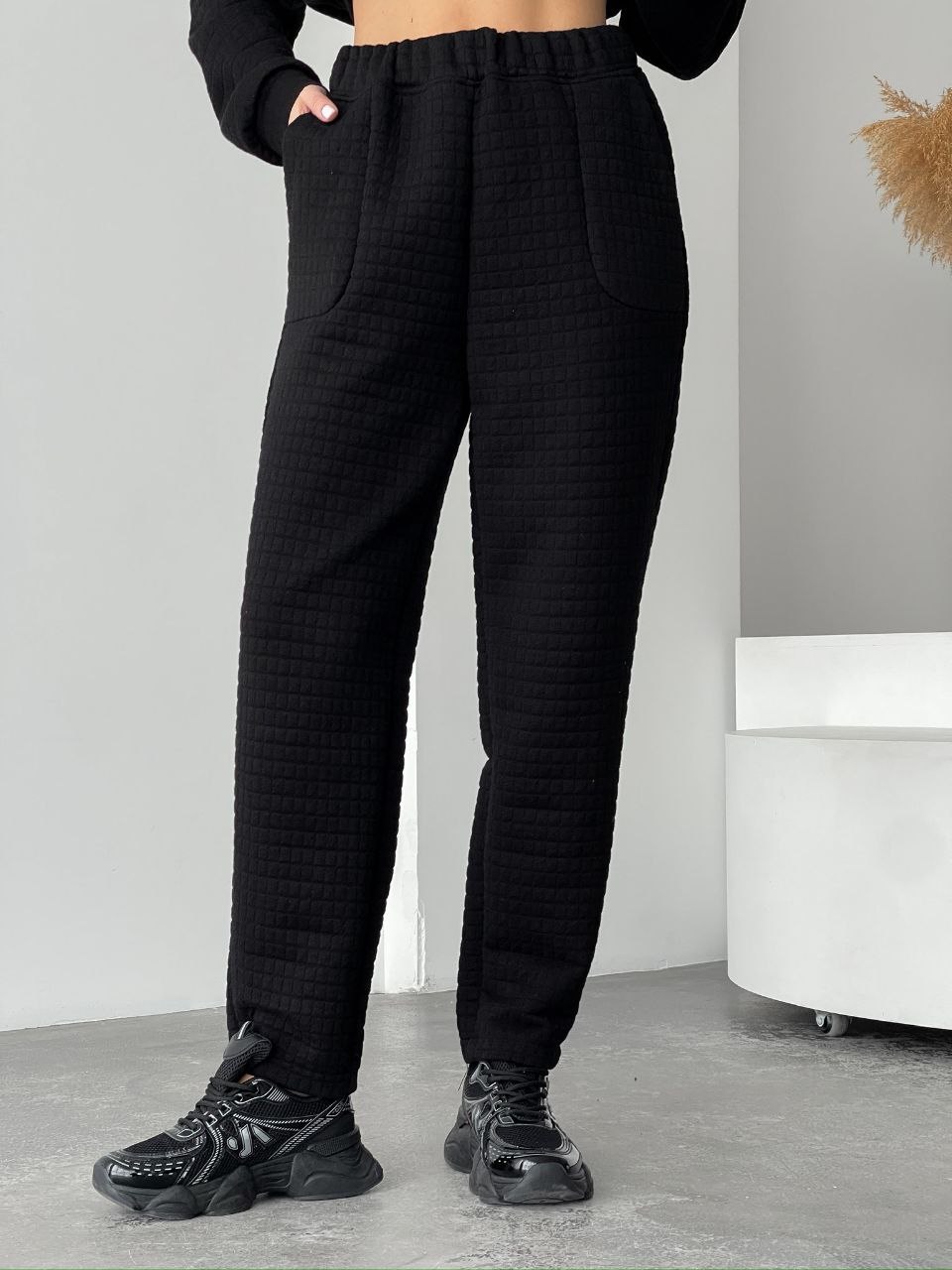 Брюки из стеганного трикотажа (не тянется) высокая посадка с накладными карманами черный