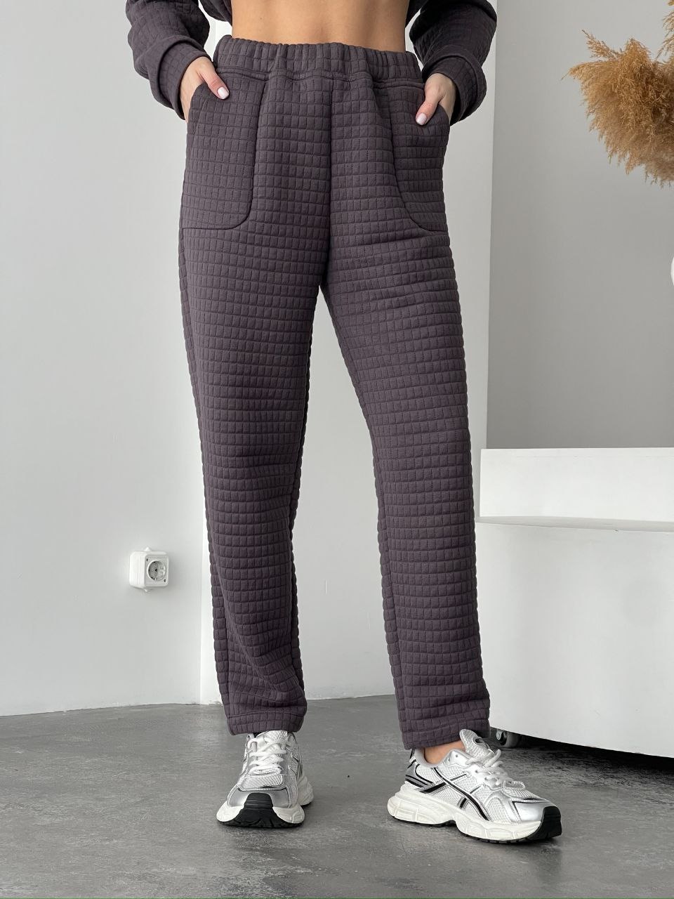 Брюки из стеганного трикотажа (не тянется) высокая посадка с накладными карманами графит