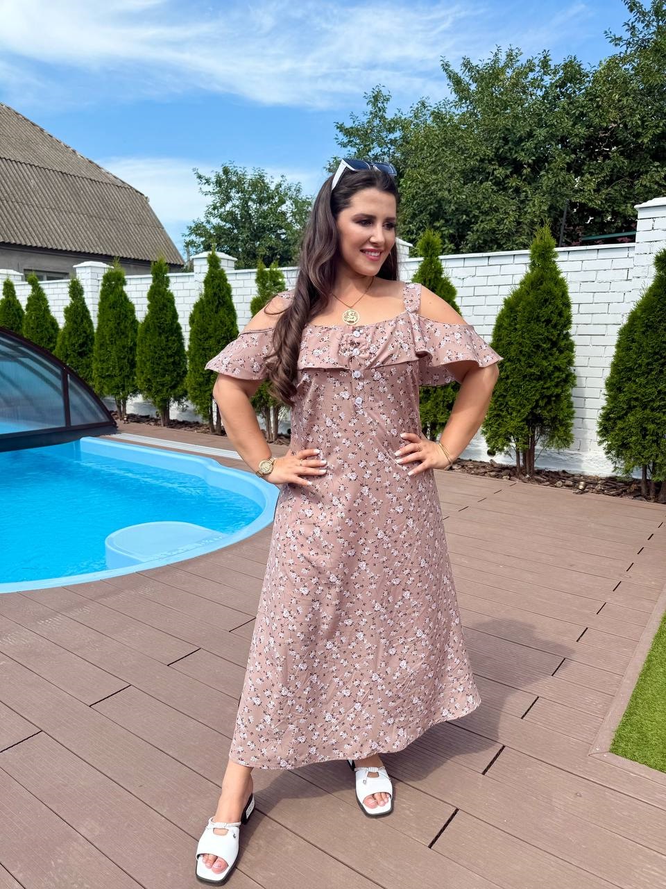 Удлиненный сарафан на бретельках: на груди рабочие пуговицы, по бокам разрезы до колена, на груди и рукавах воланы.