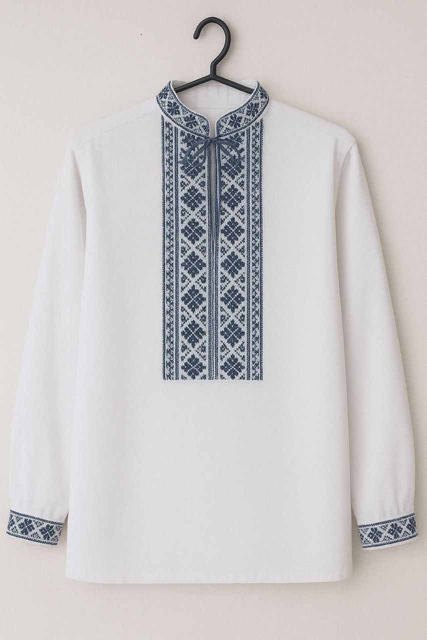 Стильная украинская вышиванка: декоративная лента на груди и рукавах, манжеты на пуговицах и воротник, завязываемый шнурком.