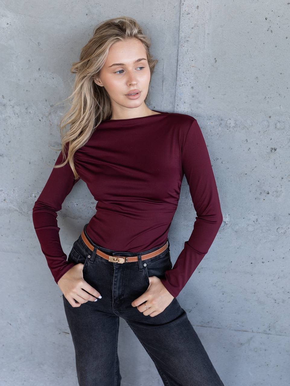 Эластичный боди из микродайвинга с драппировкой в зоне декольте бордо