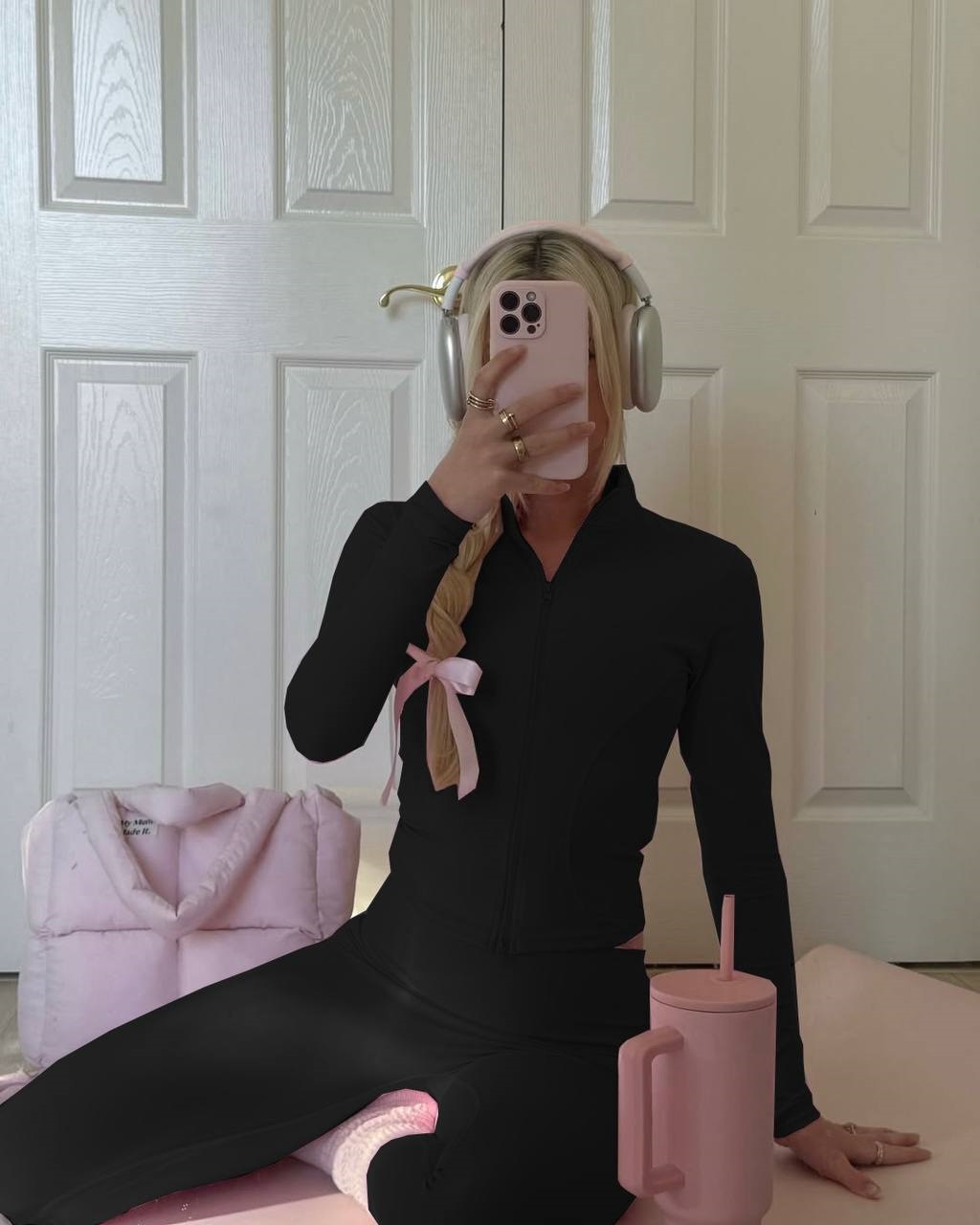Эластичный костюм из микродайвинга (лосины+укороченная кофточка на молнии) черный
