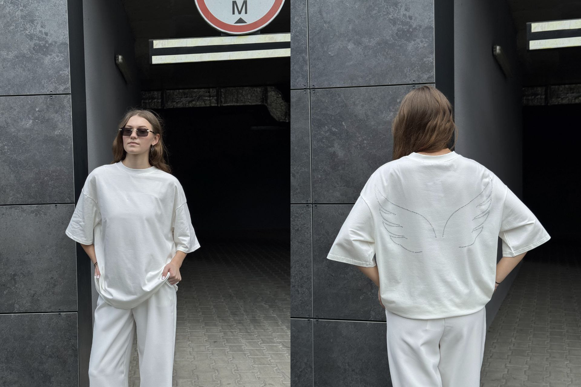 Футболка оверсайз с накатом по спинке камнями Крылья молочный