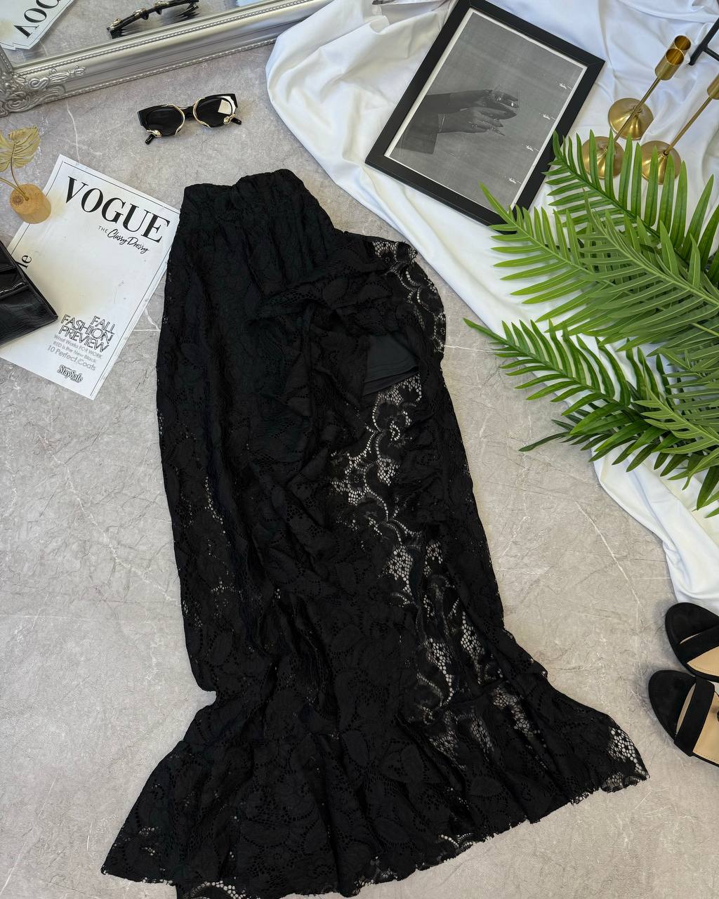Кружевная юбка с шортиками. Сбоку на ножке небольшой разрез. Шортики идут сшитые с юбкой. В талии на резинке.