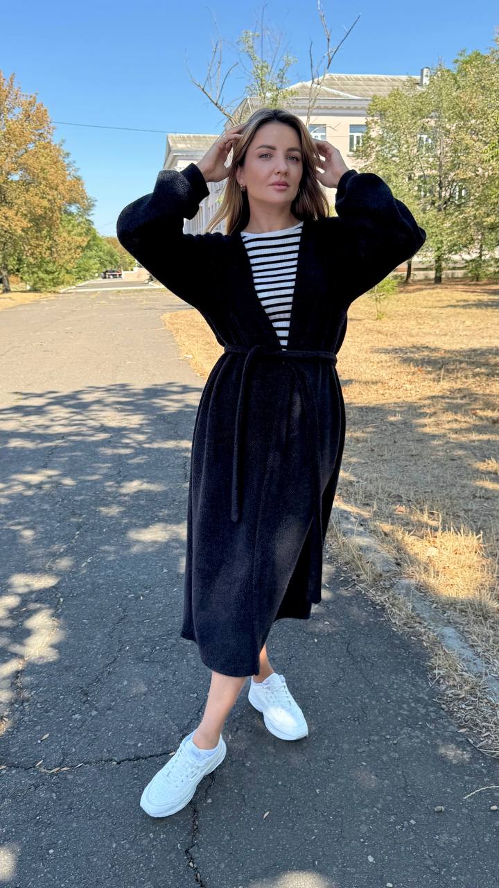 Кардиган удлиненный, рукав широкий, плечо спущено, пояс идет отдельно, не пришит, ткань тянется