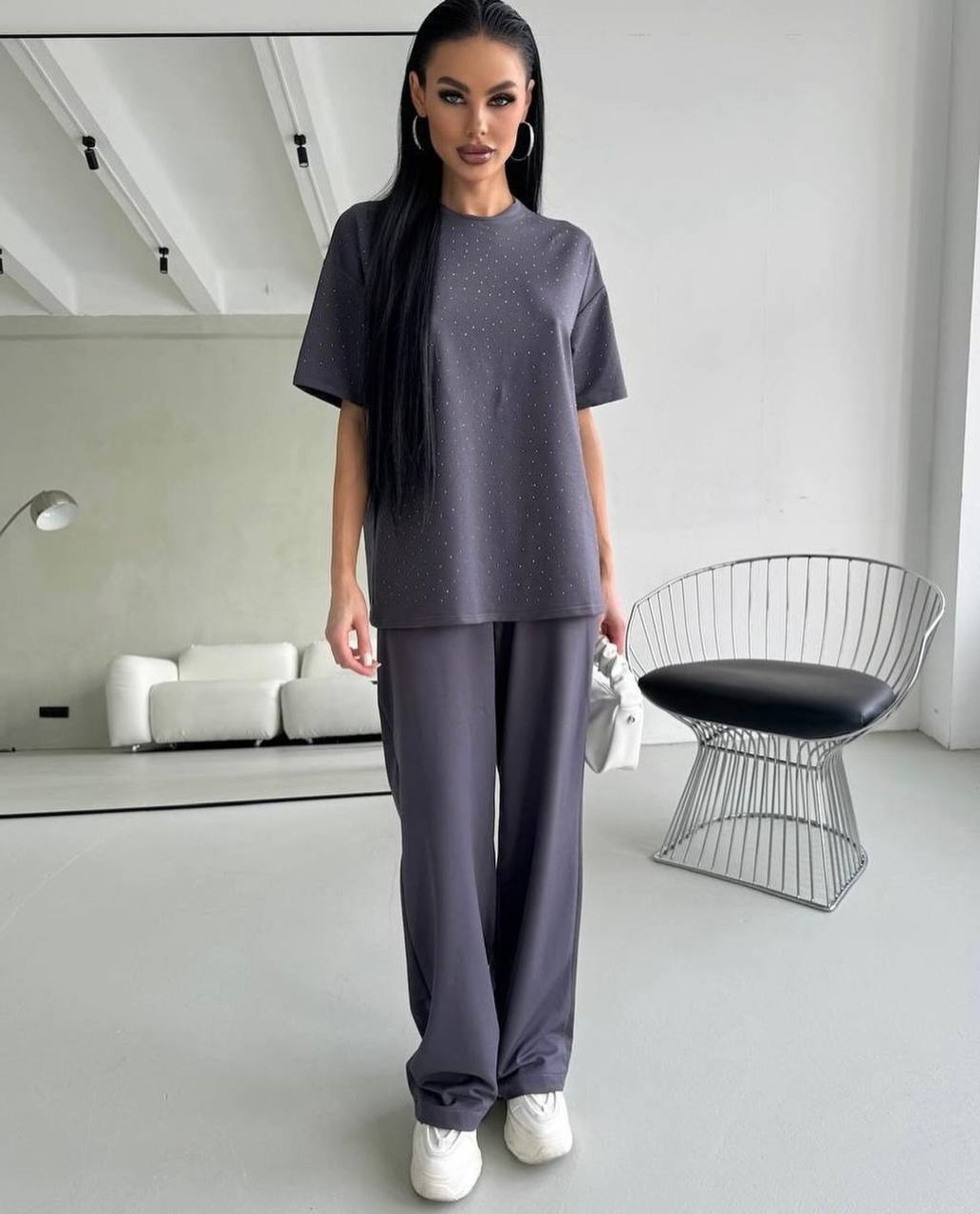 Классный костюм (брюки+футболка принтованная блестящими камнями) графит