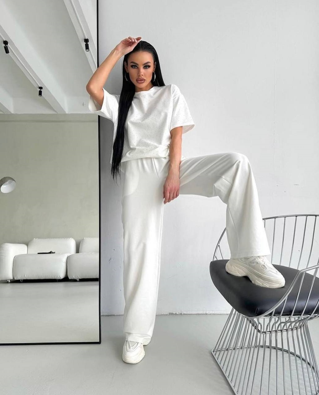Классный костюм (брюки+футболка принтованная блестящими камнями) белый