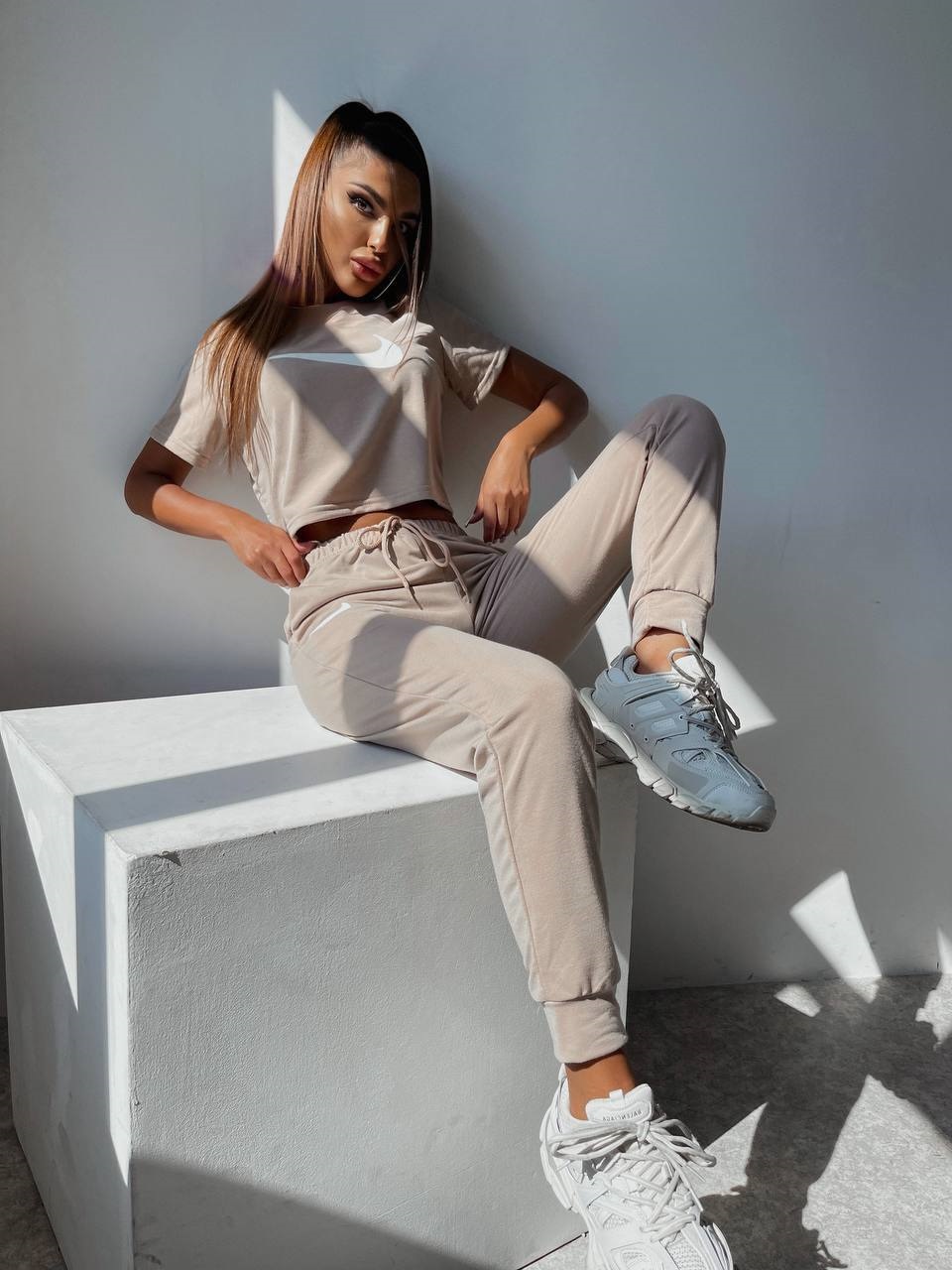 Классный костюм двухнитка (укороченная футболка с коротким рукавом+джоггеры) бежевый
