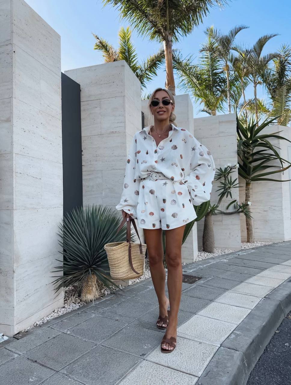 Рубашка свободного кроя, застегивающаяся на пуговицы, объемные рукава на резинке, на спинке отрезная планка для идеальной посадки, шорты с карманами, сзади на широкой резинке, на поясе шлицы для ремня