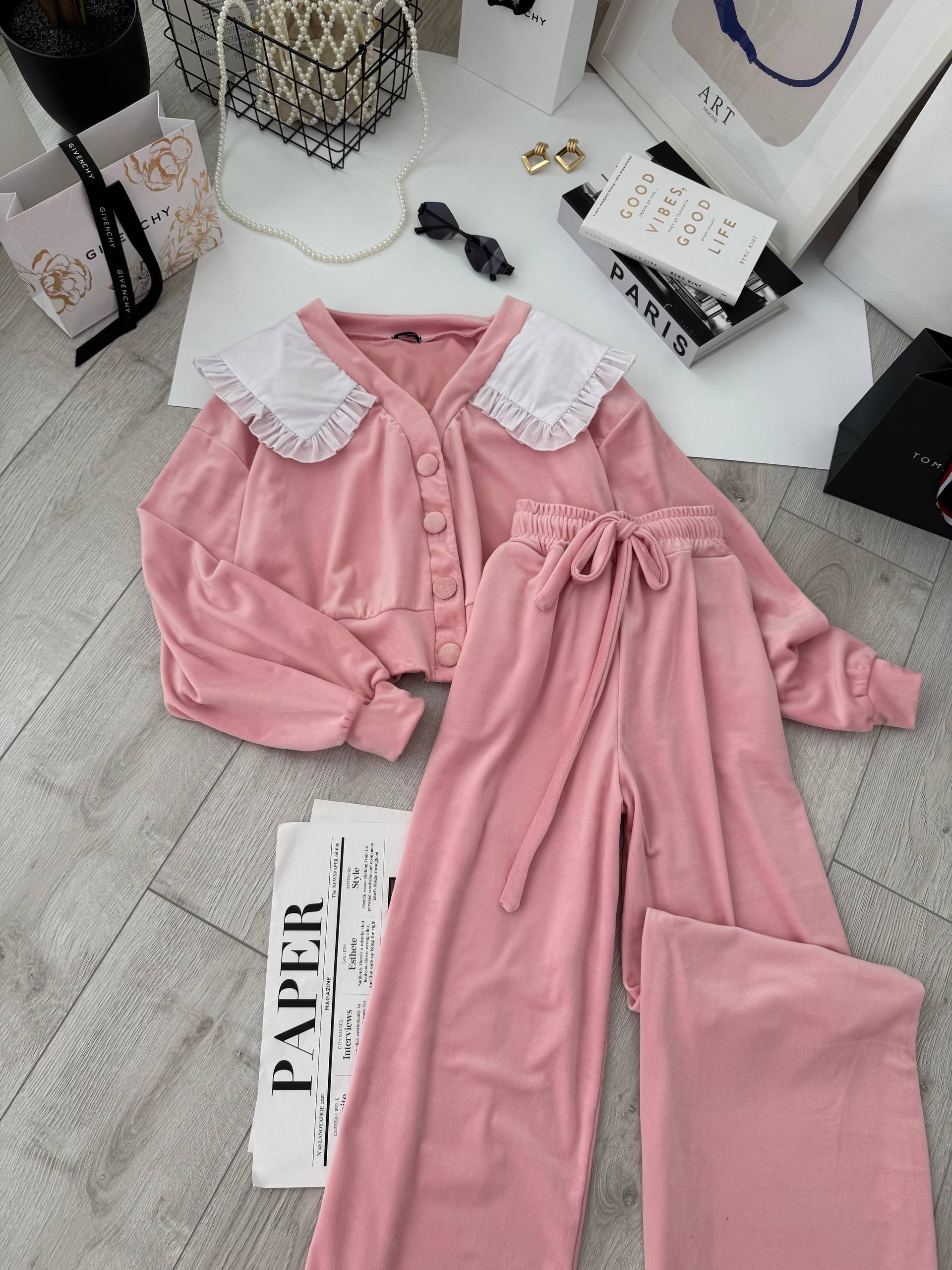 Костюм из плюшевого велюра: кофта с воротничком+прямые штаны розовый