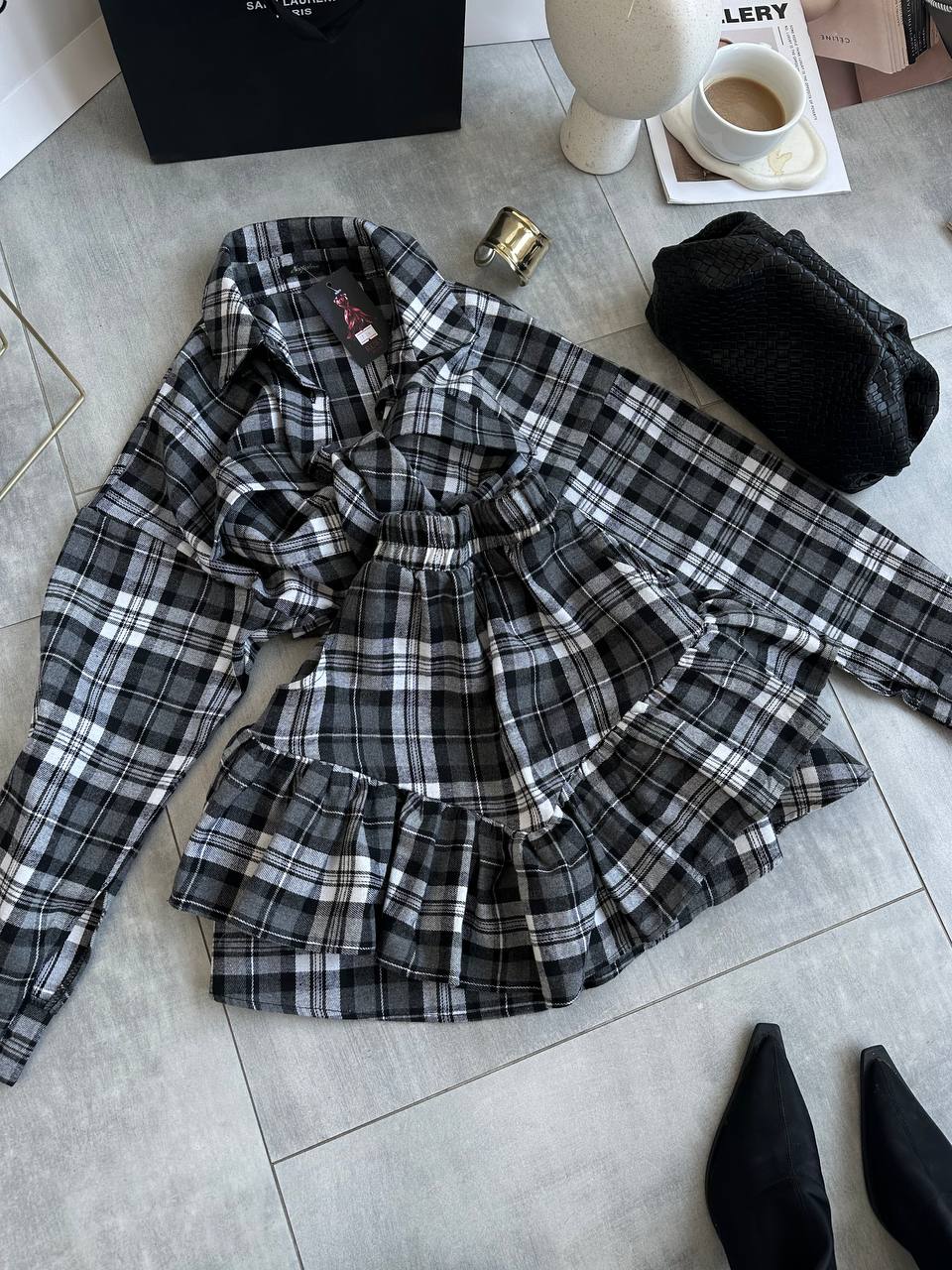 Клетчатый принт добавляет изюм и делает этот сет универсальным – он все равно будет эффектно выглядеть как в повседневных, так и в деловых или вечерних образах.
