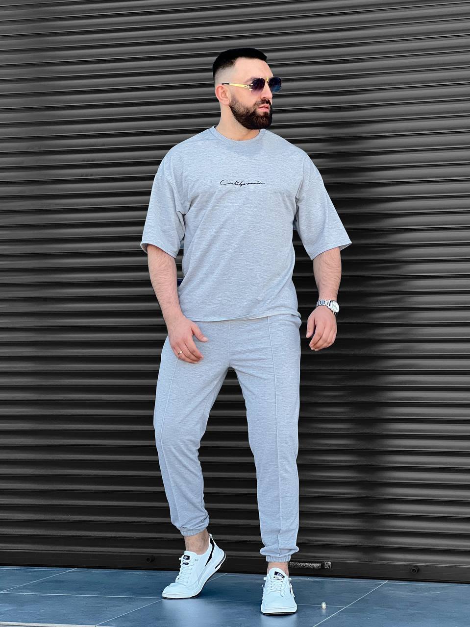 Костюм мужской брючный: футболка свободная+штаны пояс и низ на резинке серый