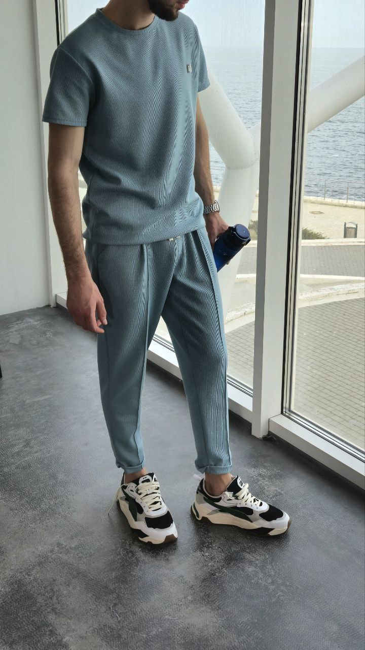 Костюм мужской: Футболка с фактурной текстурой+брюки с боковыми карманами олива