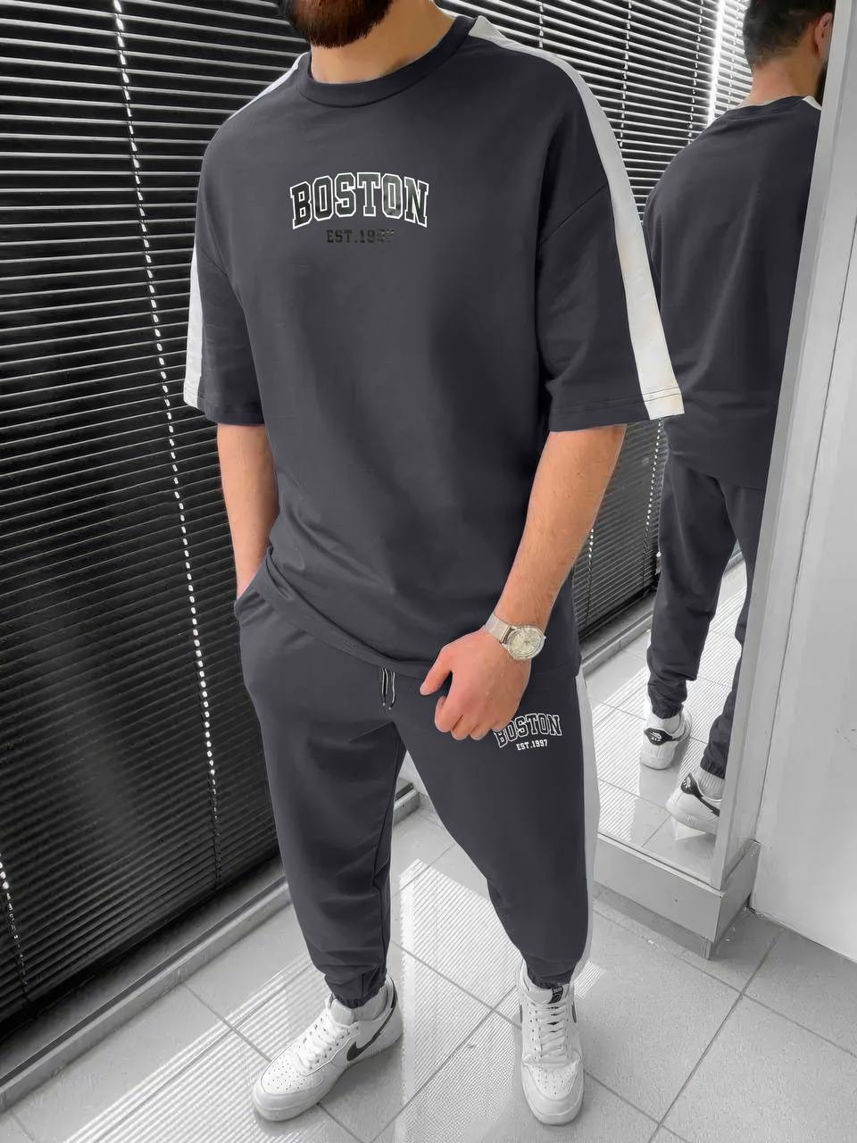 Костюм мужской: Футболка с принтом на груди+штаны с шнурком графит