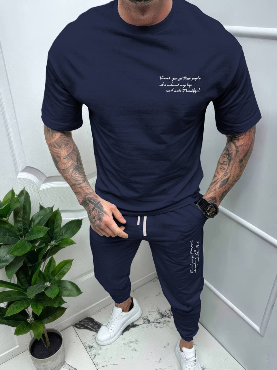 Костюм мужской (Футболка с принтом+брюки с шнурком) темно-синий