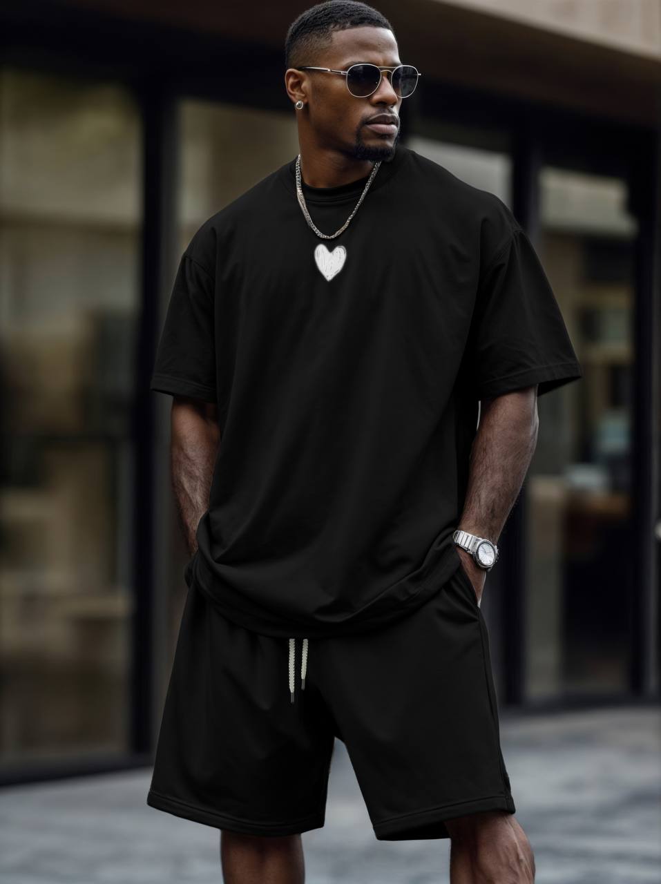 Костюм мужской: Футболка свободного кроя с округлым вырезом и наклейкой сердце+шорты черный
