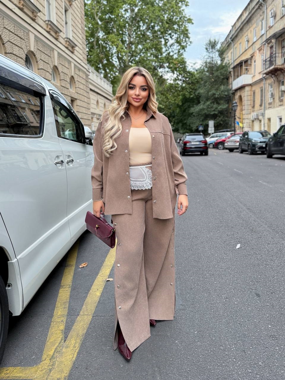 Костюм оверсайз из вельвета (рубашка+брюки палаццо с высокой посадкой+кнопками по бокам) мокко
