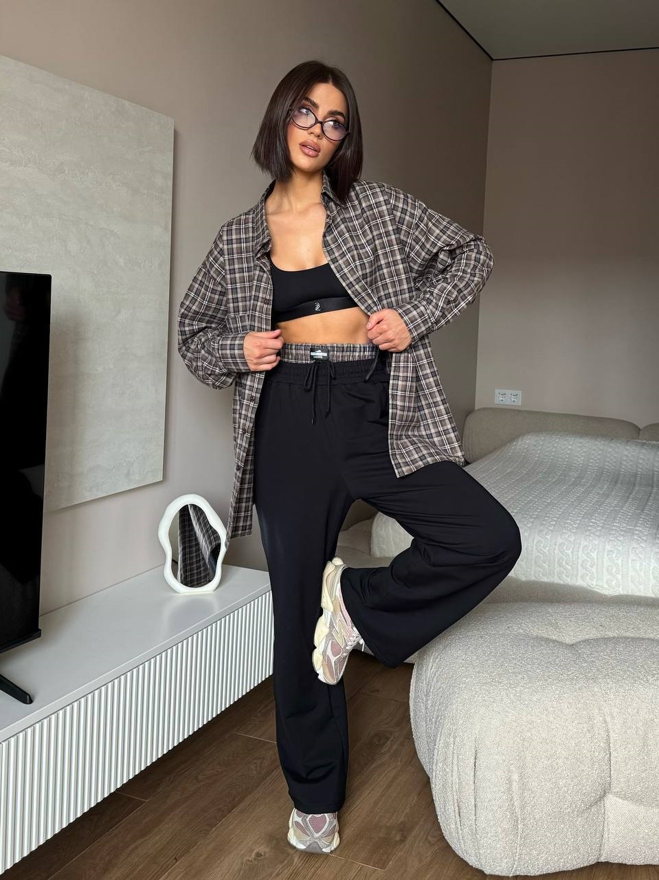 Костюм (Рубашка свободного кроя в клетку фланель+Брюки палаццо двухнитка) Шоколад+Черный