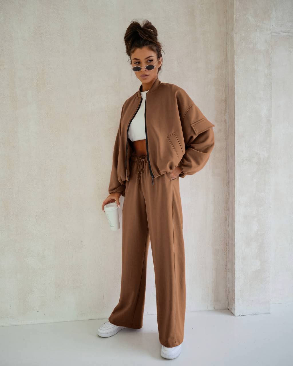 Костюм с просторными брюками на резинке со шнурком и карманами и укороченной кофтой со спущенным плечом и резинкой по низу.