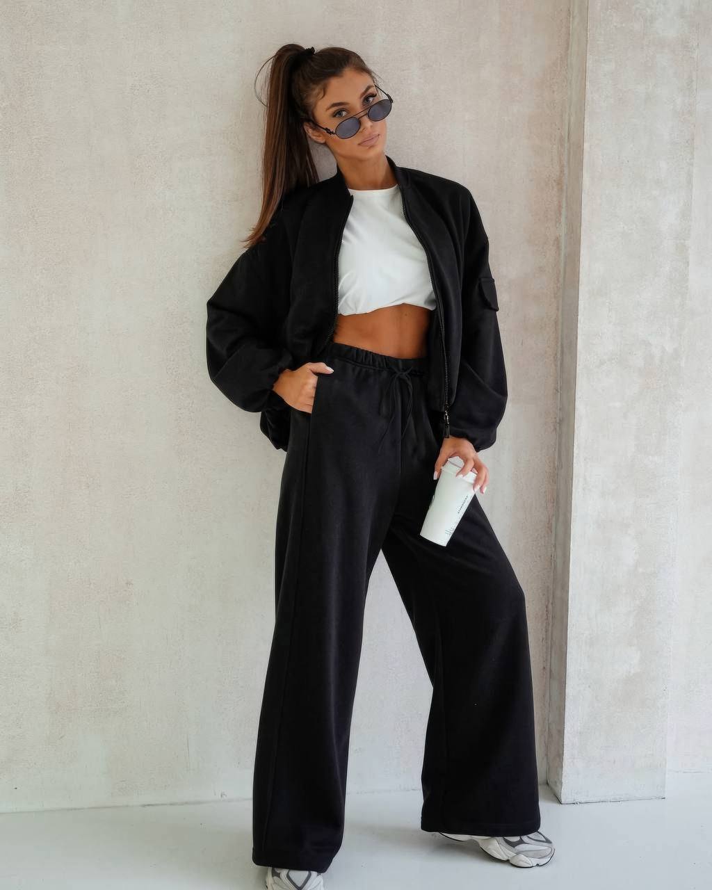 Костюм с просторными брюками на резинке и укороченной кофтой со спущенным плечом черный