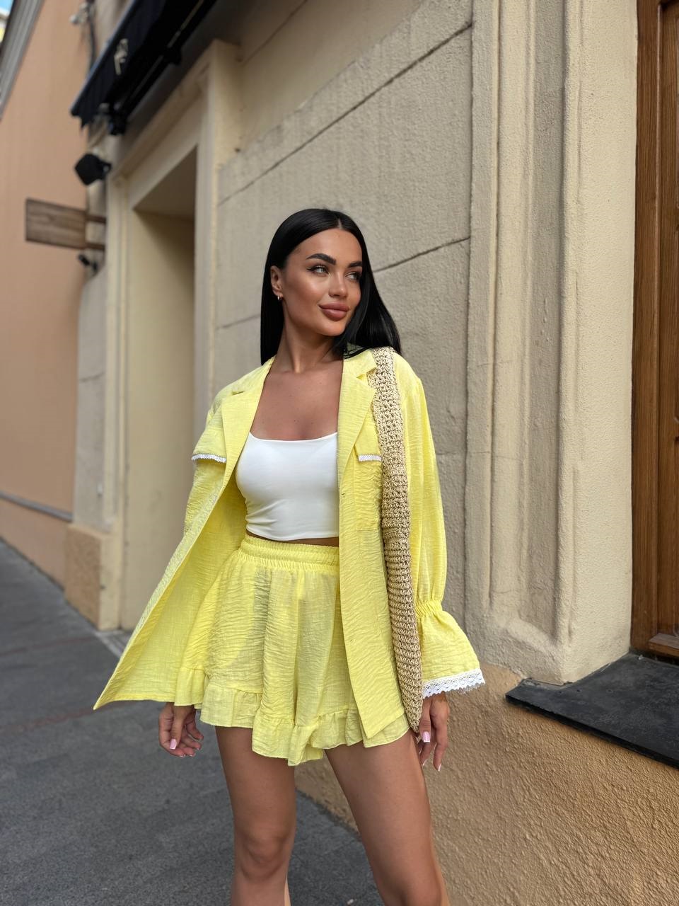 Костюм свободного кроя в пижамном стиле (рубашка+шорты-юбка) лен жатка лимон