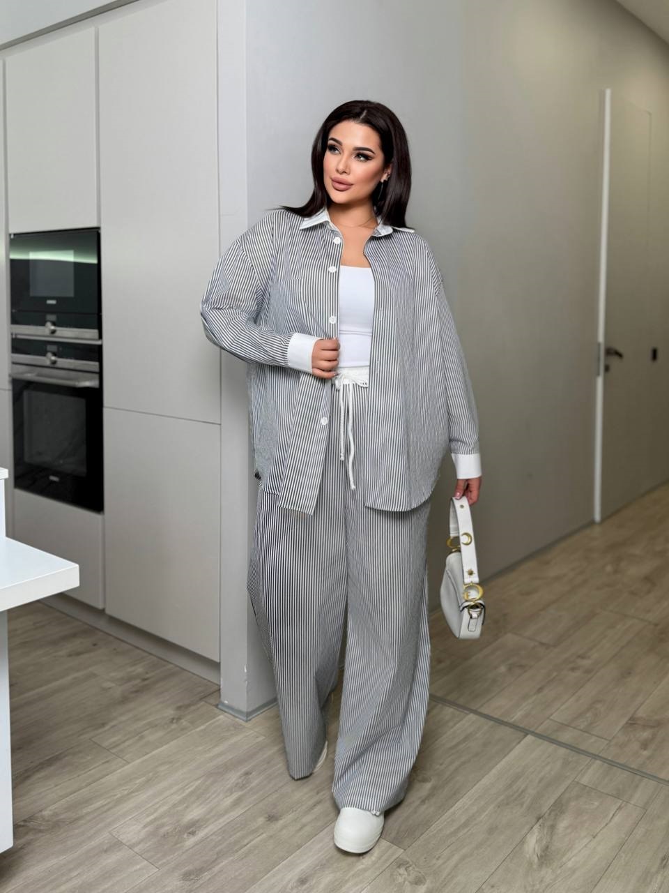 Костюм (свободные брюки+рубашка с контрастными воротником+манжетами) коттон принт полоска черный