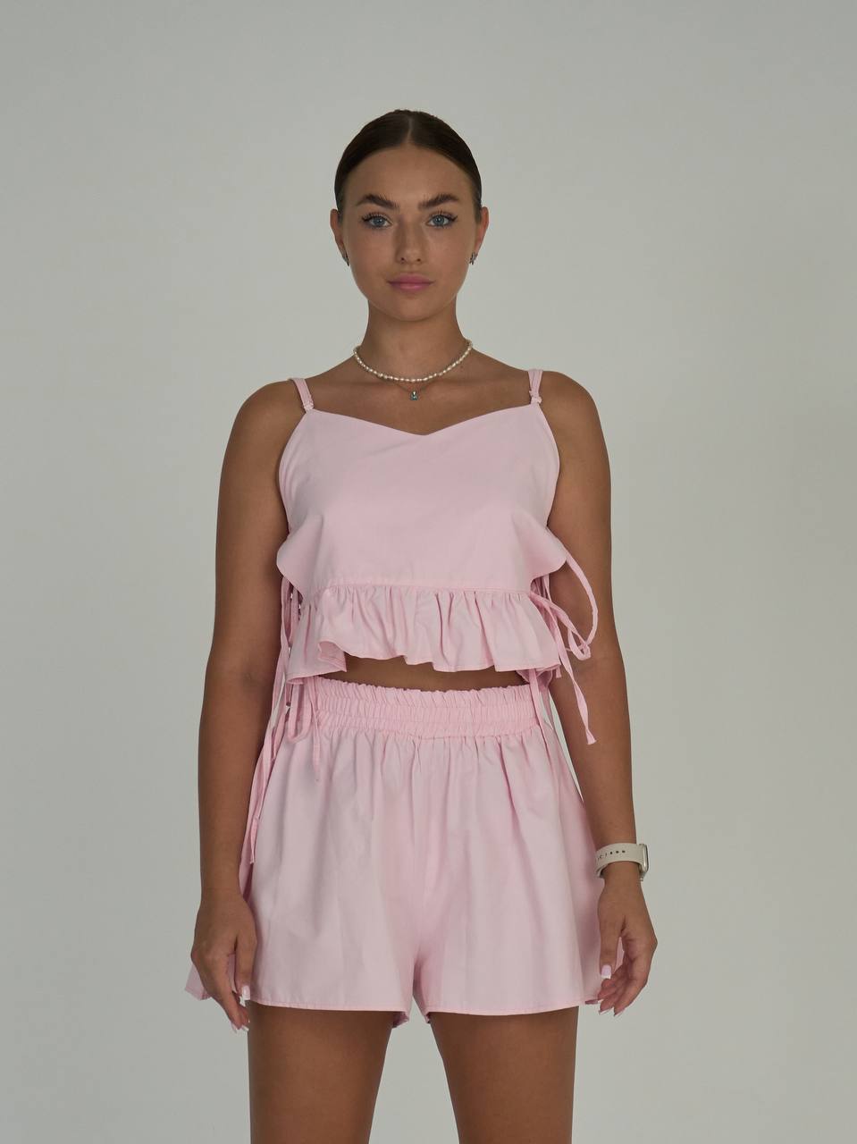 Костюм из 100% хлопковой ткани — отличный летний выбор под спортивную или изящную обувь. Топ регулируется по длине бретели и объему, шорты комфортной посадки.