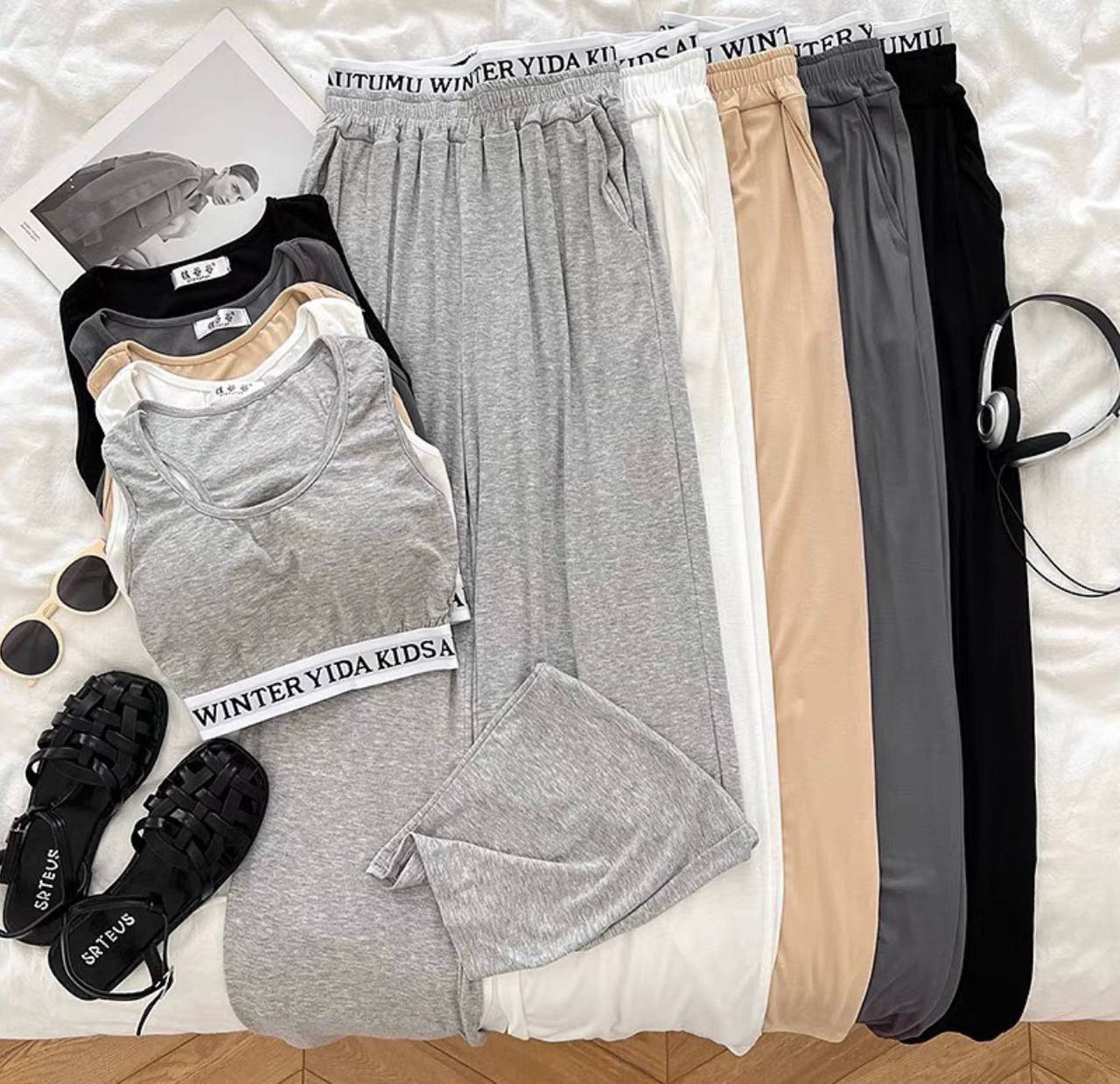 Практичный спортивный костюм на каждый день. Топ имеет чашки и идет с резинкой снизу. Брюки на резинке, с карманами и свободного кроя. Актуальные цвета.