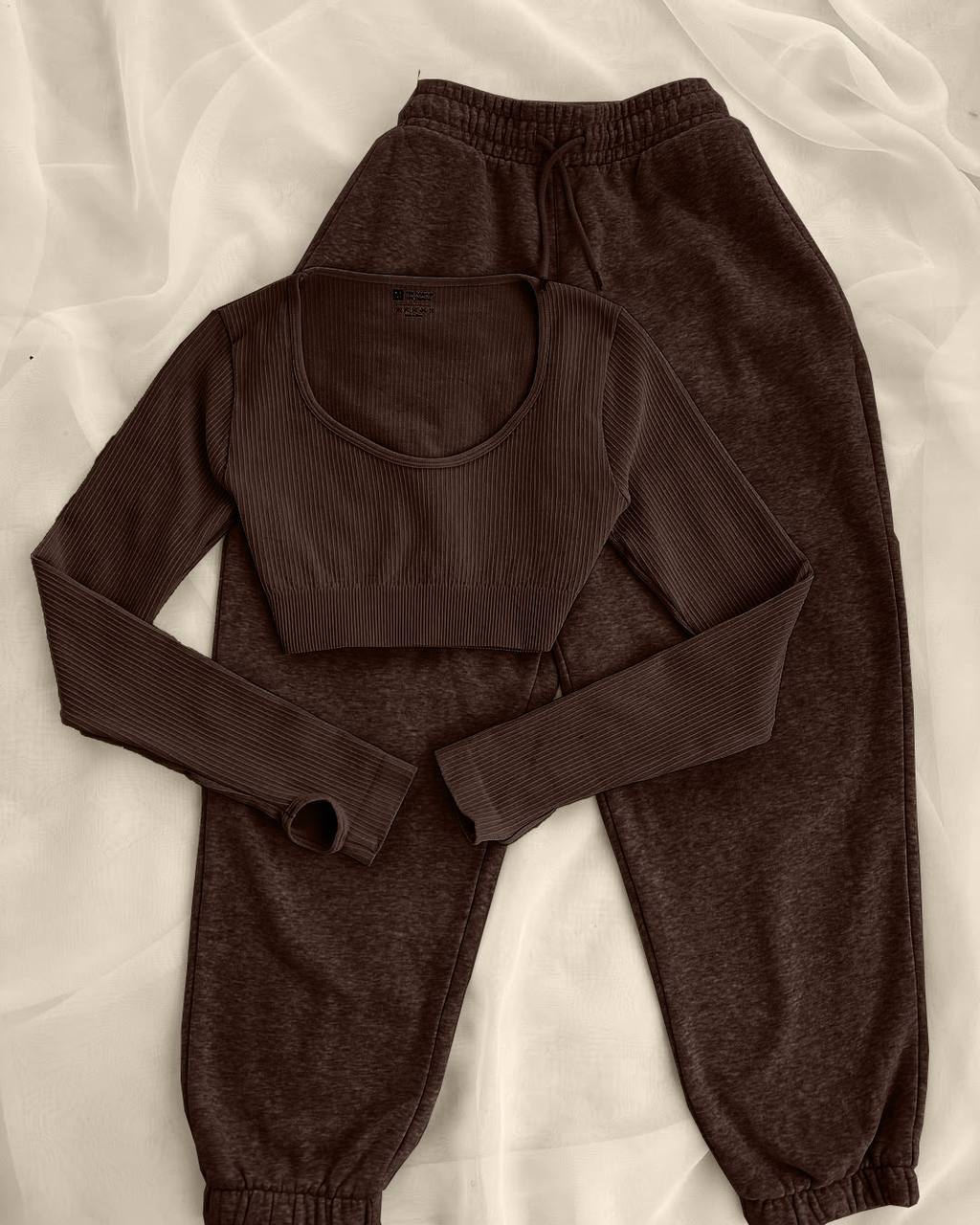 Костюм: топ с длинным рукавом рубчик+ джоггеры двухнить шоколад
