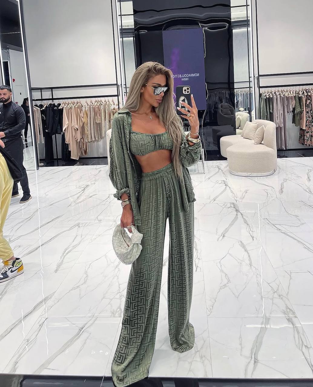 Костюм тройка из шелка армани (Рубашка+топ на бретелях+брюки палаццо) Фисташка