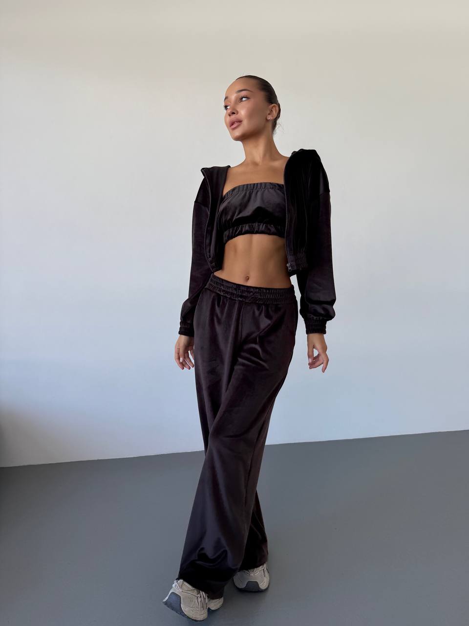 Костюм-тройка: кофта с двойным капюшоном+топ+прямые штаны шоколад