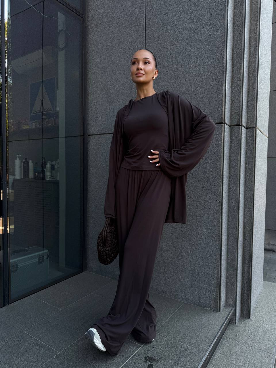 Состоят из лонга, штанов палаццо и кардигана с капюшоном.