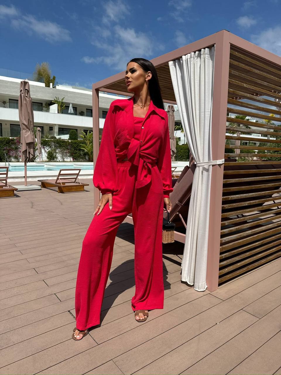 Костюм-тройка: топ-бандо на резинке+брюки палаццо+легкая рубашка красный